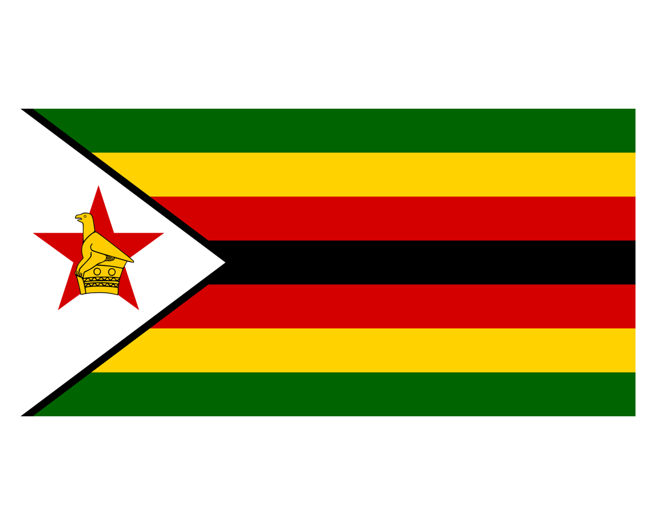 津巴布韋共和國(The Republic of Zimbabwe),簡稱津巴布韋,原稱羅得西亞(1980年前),是非洲東南部內(nèi)陸國,1980年4月18日獨立,首都哈拉雷。津巴布韋國旗啟用于1980年4月18日。呈橫長方形,長與寬之比為2∶1。靠旗桿一側(cè)為帶黑邊的白色等腰三角形,正中一顆紅色五角星,星內(nèi)有一只津巴布韋鳥,白色象征和平,五角星代表國家和民族的良好愿望,津巴布韋鳥是該國特有的標志,也是津巴布韋和非洲國家古老文明的象征;右側(cè)為七道平行橫條,黑色居中,向上下兩邊依次均為紅、黃、綠色。黑色代表占人口多數(shù)的黑人,紅色象征人民為爭取獨立而灑的鮮血,黃色象征礦產(chǎn)資源,綠色代表國家的農(nóng)業(yè)。