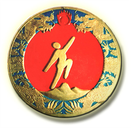 方字變化為人,飛于方山之上,寓意方姓因方山得姓,外環雙龍吞日寓意中華文明,色彩紅黃為主,顯示風貌昂揚向上