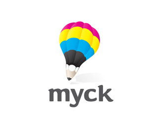 Myck字謎CMYK:青色,洋紅色,黃色和黑色這四個印刷顏色,做為設計師你每天都會看到這四個顏色,Myck這個設計師個人標志采用這些顏色和鉛筆尖、熱氣球一起設計出一個漂亮的標志。